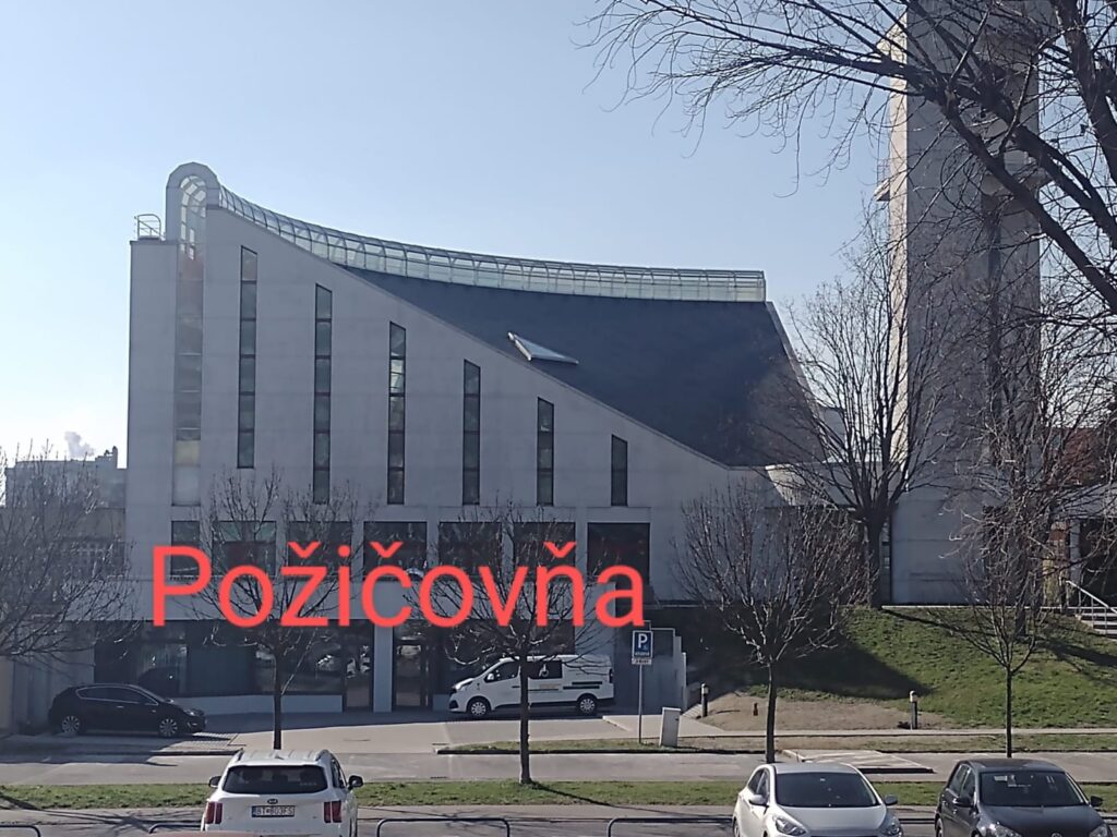 Tomášikova 8 (Farský úrad Ružinov), Bratislava – Ružinov. Vchod do požičovne je od parkoviska zo Seberíniho ulice.