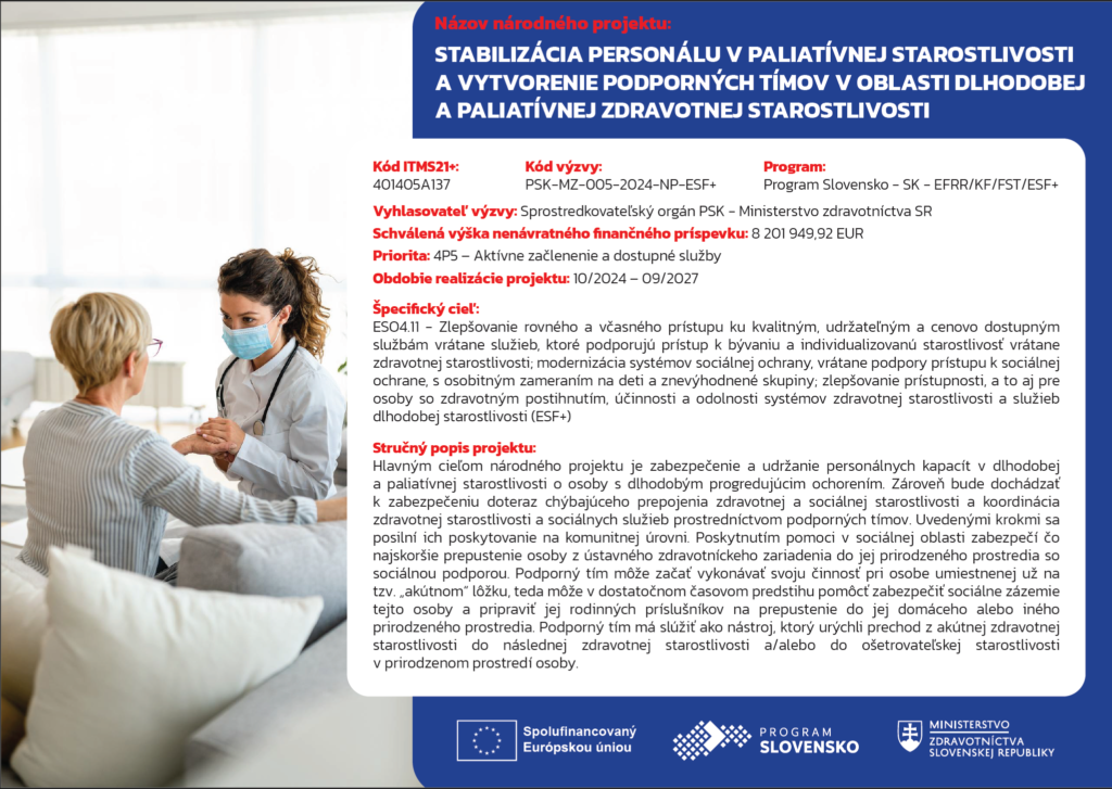 Stabilizácia personálu v paliatívnej starostlivosti a vytvorenie podporných tímov v oblasti dlhodobej a paliatívnej zdravotnej starostlivosti Obdobie projektu: 6/2025-9/2027 Výška schválených finančných prostriedkov: 96 804,96€